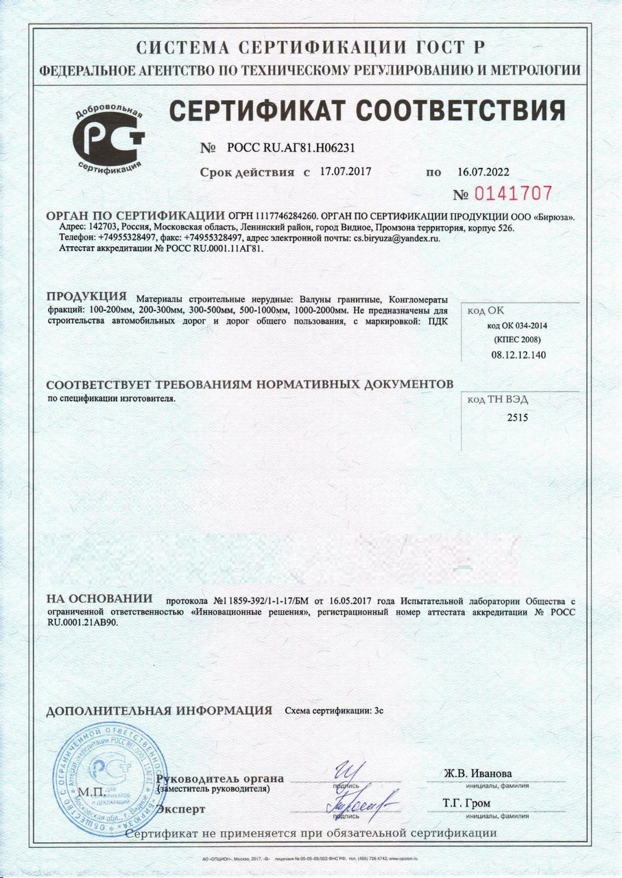 Сертификат соответствия – документ, подтверждающий соответствие продукции требованиям качества и безопасности, установленными для нее действующими стандартами и правилами. Наш камень, который Вы сможете заказать с доставкой в Москве , обладает всеми необходимыми документами для реализации и при необходимости могут быть предоставлены все необходимые подтверждающие документы при поставке.